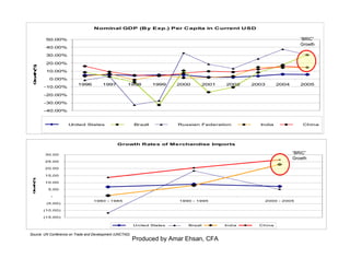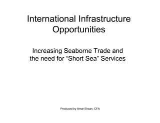 The document discusses the increasing demand for 'short sea' shipping services driven by growing international trade, particularly among BRIC nations, and highlights the need for significant upgrades in port infrastructure to accommodate larger vessels. It outlines investment opportunities in maritime infrastructure projects, emphasizing the importance of private-public partnerships and new transaction models to enhance efficiency in harbor operations. Additionally, it provides specific examples of infrastructure projects and avenues for investment in emerging markets such as Vietnam, India, and the MENA region.