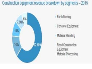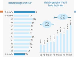The infrastructure sector is a key driver of the Indian economy, contributing 5% of India's GDP. It includes electricity, roads, ports, airports, railways, and telecommunications. The government has allocated nearly $400 billion for infrastructure in the upcoming fiscal year. India needs $450 billion in infrastructure investment over the next 5 years, with 70% needed for power, roads, and urban development. Growth in the construction equipment industry is expected to reach $5 billion by 2020 due to increased investment in infrastructure projects.