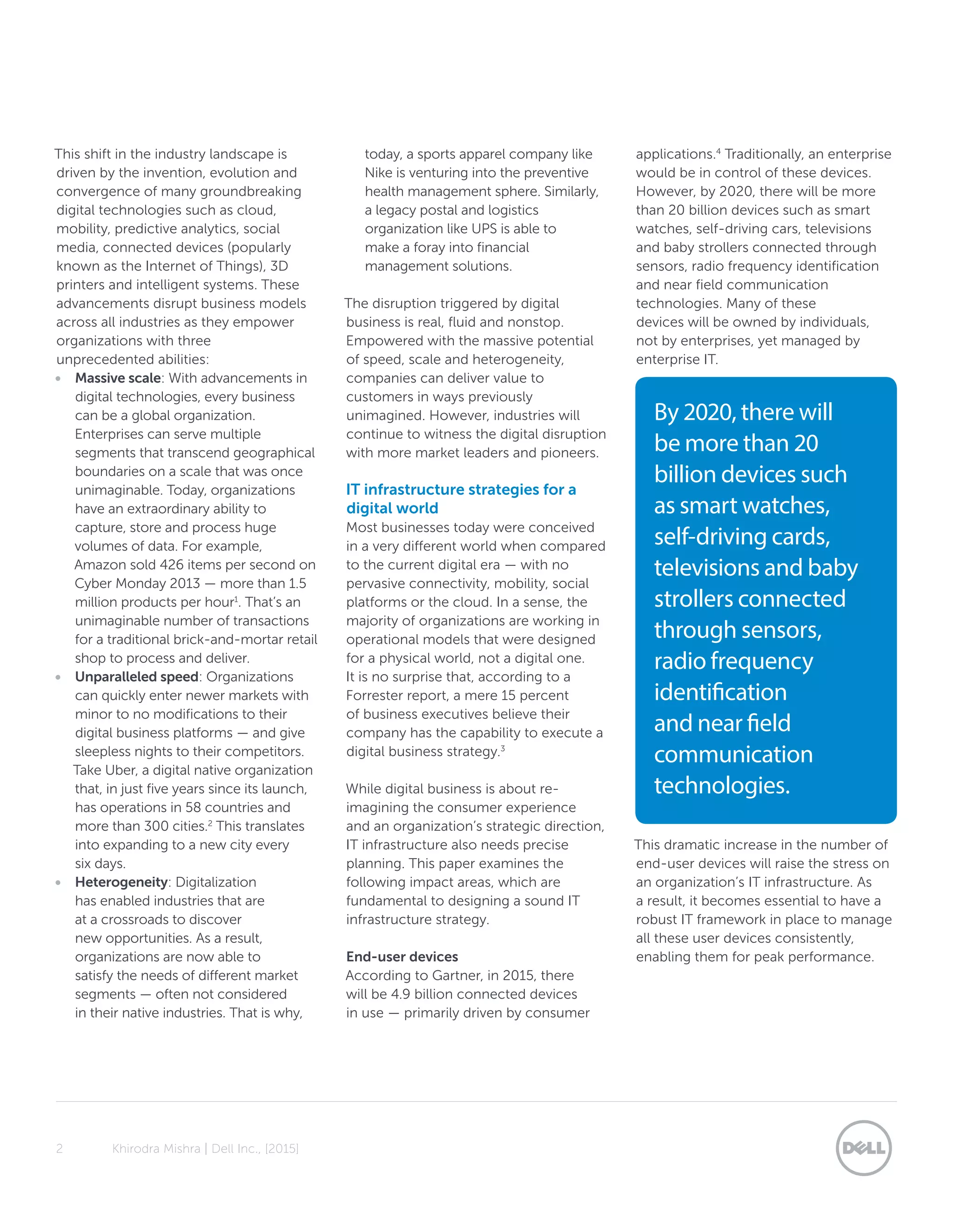 1) End-user devices as the number of connected devices dramatically increases and must be managed, 2) Enterprise storage to accommodate exponentially growing data capture and storage needs, 3) Enterprise computing as consumer-centric mobile apps and wearables take center stage, 4) Networking capabilities must be strengthened to support real-time processing of vast data volumes without disruption, and 5) Security which is critical to prevent huge losses from data breaches. The infrastructure strategy is fundamental to designing a sound plan for digital business.