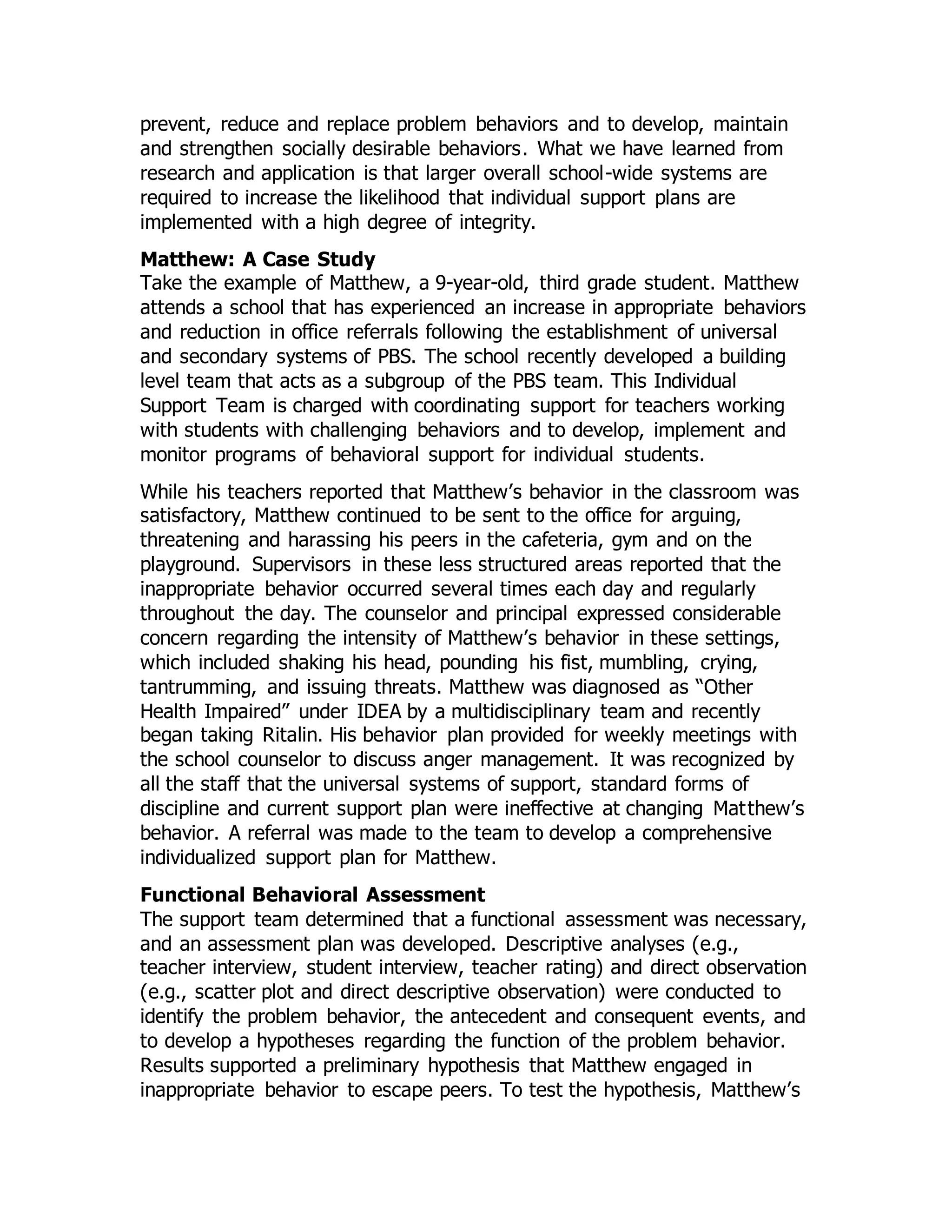 The document discusses how individualized behavior support plans should be connected to and supported by school-wide positive behavior support systems. It provides the example of Matthew, a student who was disruptive in non-classroom settings due to wanting to escape peers he disliked. A functional behavior assessment found this was the function of his problem behavior. His individualized plan addressed environmental changes to prevent problematic peer interactions, taught replacement skills like using "I statements" to request different groups, and provided social skills training. Monitoring found the plan reduced his problem behavior, and connecting it to school-wide systems helped generalize the skills across settings. The conclusion emphasizes that strong universal supports increase individual plan success by allowing environmental alterations and targeted interventions to prevent chronic