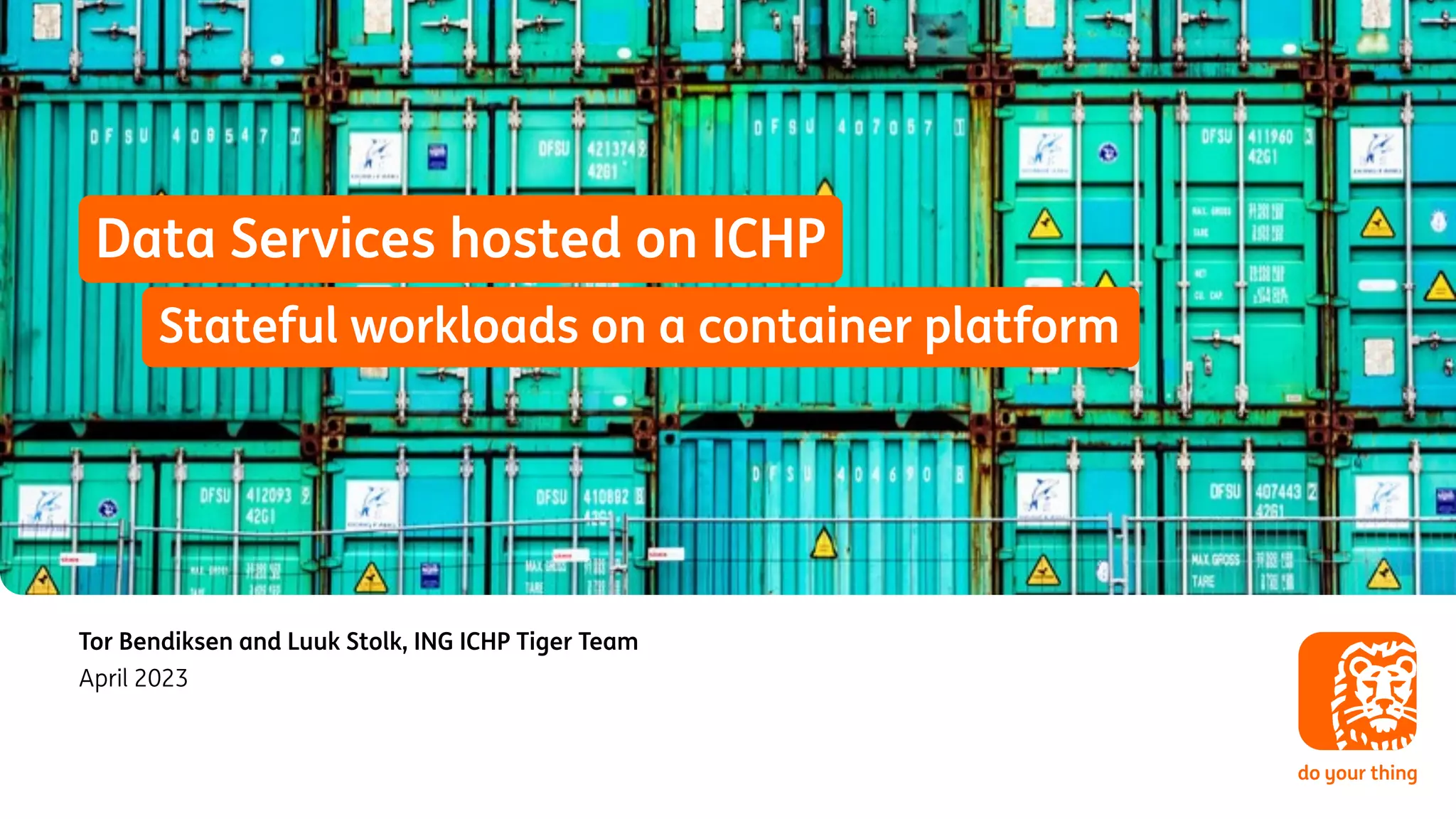 The document provides an overview of the ING Container Hosting Platform (ICHP) and its data services, emphasizing the platform's features such as scalability, compliance, and automation. It compares ICHP v1 and v2, highlighting improvements in infrastructure provision, security measures, and deployment processes. Additionally, it discusses various storage layer options and data service responsibilities to optimize persistent data management within containerized environments.