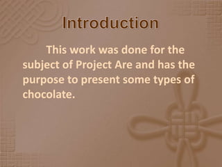 The document discusses different types of chocolate. It describes bitter chocolate, black chocolate, milk chocolate, white chocolate, chocolate topping, chocolate powder, and dietary chocolate. It explains the key ingredients that differentiate each type of chocolate and notes that while the varieties of chocolate seem endless, all types of chocolate are delicious.