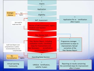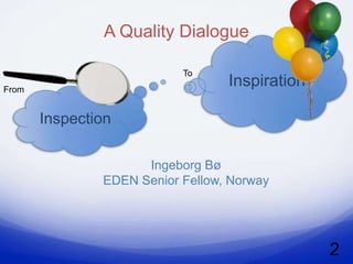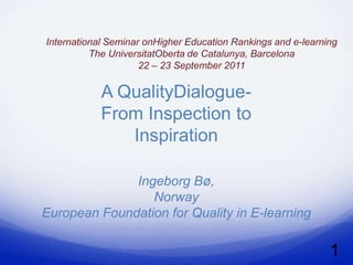 The document summarizes a presentation about quality assurance in e-learning. It discusses moving from inspection to inspiration by focusing on dialogue. It provides context of operations in Europe and models for quality assurance. It also discusses a case study from Norway and perspectives after 40 years in distance education with a focus on student needs, accessible technology, and a quality culture. Recommendations are made to use standard evaluation methods adapted for online learning and ensure learner support and best practices.
