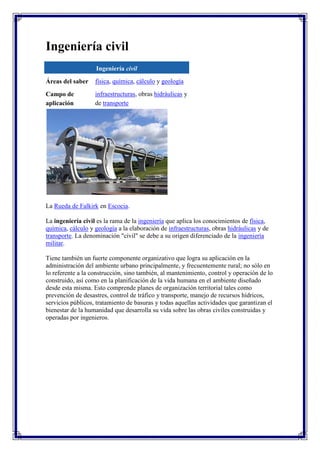 La ingeniería civil es la rama de la ingeniería que aplica conocimientos de física, química, cálculo y geología para diseñar y construir infraestructuras como carreteras, puentes, presas y sistemas de transporte. Los ingenieros civiles utilizan sus conocimientos de materiales, suelos, hidráulica y estructuras para completar proyectos que van desde grandes obras hasta pequeñas construcciones. La ingeniería civil incluye campos como estructural, geotécnica, hidráulica