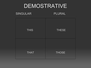 This document discusses demonstrative pronouns in English including this, that, these, and those. It notes that this and that are singular demonstratives while these and those are plural demonstratives used to refer to things or people that are nearby or farther away from the speaker.