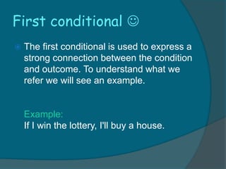 The document discusses the first conditional in English grammar. It explains that the first conditional is used to express a strong connection between a condition and its outcome. It is formed using the present simple in the if-clause and the future simple in the main clause. For example, "If I win the lottery, I'll buy a house." It also describes how to form negative first conditional sentences.