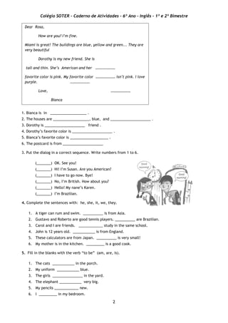 This document contains an English exercise for 6th grade students with multiple choice questions, fill in the blank exercises, matching activities and other tasks focusing on basic grammar concepts like verbs, tenses, pronouns and vocabulary. The exercises cover topics like family, descriptions, activities, locations and daily routines to help students practice and reinforce foundational English language skills.
