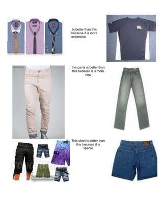 Several items are compared and one is said to be better than the other for different reasons such as being more expensive, new, sparse, branded, or comfortable.