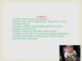 The document outlines a weekly schedule for Monday through Saturday. Each day follows a similar routine: Valery and I shower and have breakfast around 7:30am, Valery tends to the garden at 8am while I work for 4 hours. We have lunch together around 1:30pm, and then study human resources until getting lunch with family around 9pm, before eating and sleeping. Thursdays include an English class from 10am to noon.