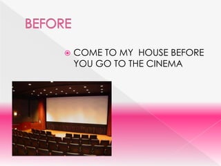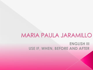 The document provides examples of using conjunctions like if, when, before and after in sentences. It gives the sentences "Come to my house before you go to the cinema", "I will give you the book when I finish reading it", "If I had money I would give you a car", "I will visit my sister after I finish my job", and "We will go to the party after we have dinner" as examples of using these conjunctions to indicate timing or conditions in sentences.