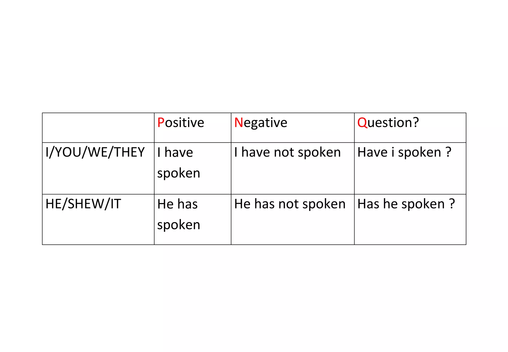 The document discusses whether different subjects have spoken or not, with positive, negative, and question versions for each subject - I/YOU/WE/THEY and HE/SHE/IT. It presents a simple structure analyzing speech in relation to different grammatical subjects.