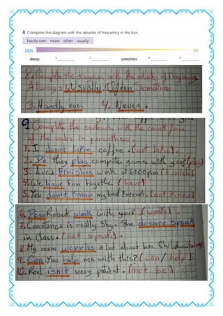 This document provides exercises about activities, hobbies, and verb tenses. It begins with matching activities like going to concerts or collecting records with pictures. Later exercises include completing sentences with verbs in different tenses like simple present and present continuous, identifying verb tenses in sentences, and answering questions using the simple past tense. The document contains information and practice with present and past verb tenses.