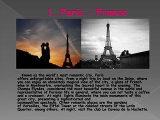 Paris is known as the world's most romantic city, with magical views of the city from the Seine at night and romantic places like Montmartre and the Champs-Elysees. Other romantic European cities mentioned include Venice, known for its canals, bridges and Piazza San Marco; Vienna, with its imperial palaces and forests; and Prague, with its historic bridges, squares and astronomical clock. The document also discusses romantic destinations in Bali, Barcelona, Cartagena, New York City, Rome, and San Francisco.