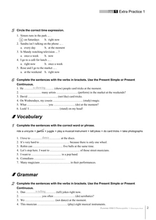 This document provides practice exercises related to vocabulary, grammar, and professions. In the vocabulary section, it asks students to identify and describe professions, hair, places on a map, and personality traits. The grammar section focuses on verb tenses including present simple, present continuous, past simple, and comparatives/superlatives of adjectives. It includes exercises with gaps to practice these tenses and forms. Picture prompts are provided to help students complete some of the exercises.