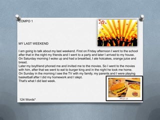 The document is a student's English homework assignments. It includes summaries of the student's weekend activities, their special person (boyfriend), last vacation, and plans for the next weekend and holidays. The assignments also include short responses about getting angry parents, fixing a problem with a friend, and celebrating their next birthday.