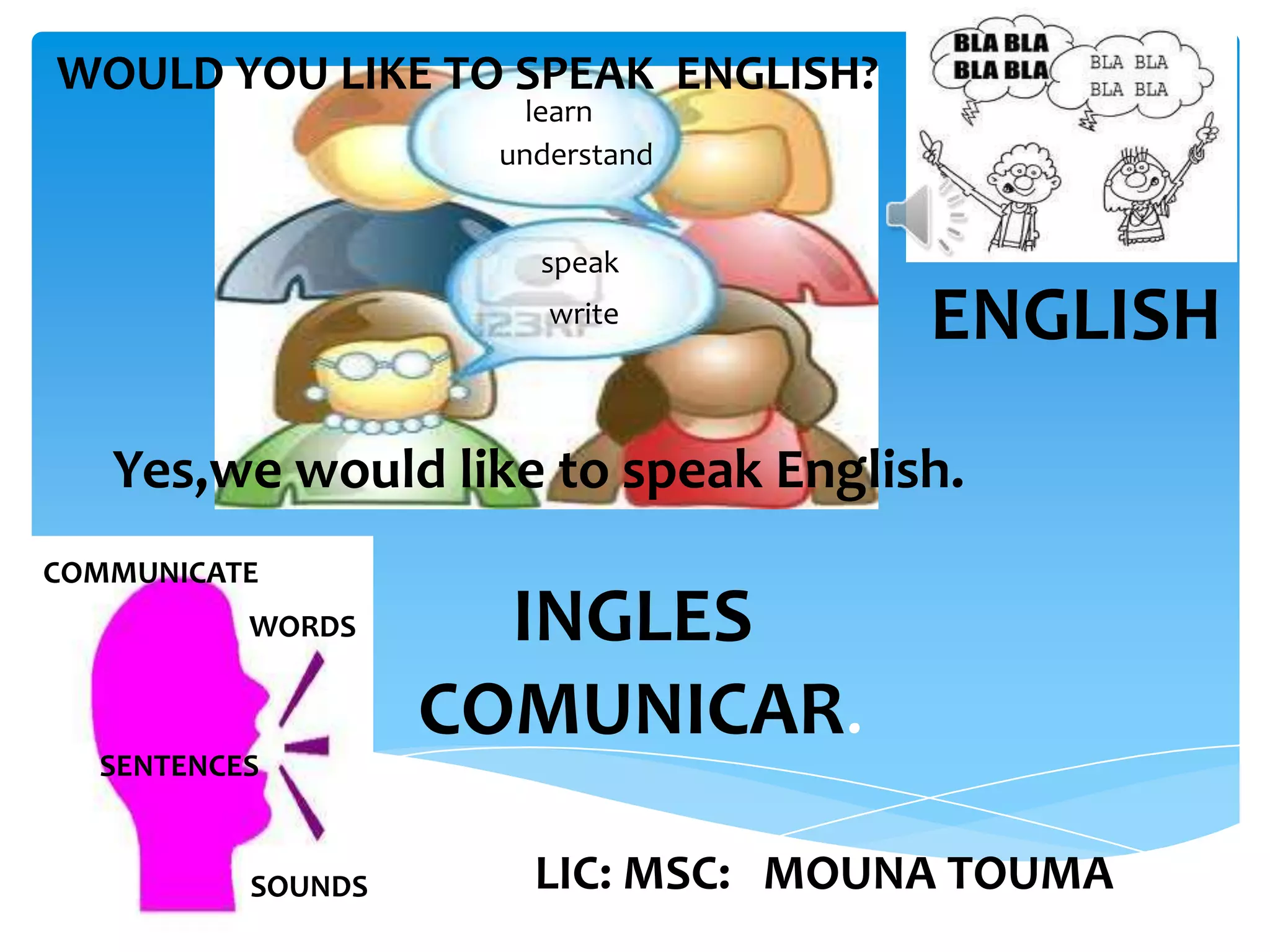- Questions and statements about learning English, communicating, and speaking.
