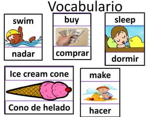 This document contains basic vocabulary words in English and Spanish, including pronouns like I, you, and pronouns, verbs like swim/nadar and buy/comprar, and nouns like ice cream cone/cono de helado, sand/arena, ocean/océano, and sandcastle/castillo de arena.