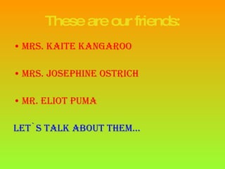 The document introduces three animals at the zoo: Mrs. Kaite Kangaroo from Australia who was a prize fighter but now works at the zoo, Mrs. Josephine Ostrich from South Africa who was a marathoner and olympic gold medalist and now lives at the zoo with her sister, and Mr. Eliot Cougar from Argentina who was a rugby player and now lives a lonely life at the zoo.
