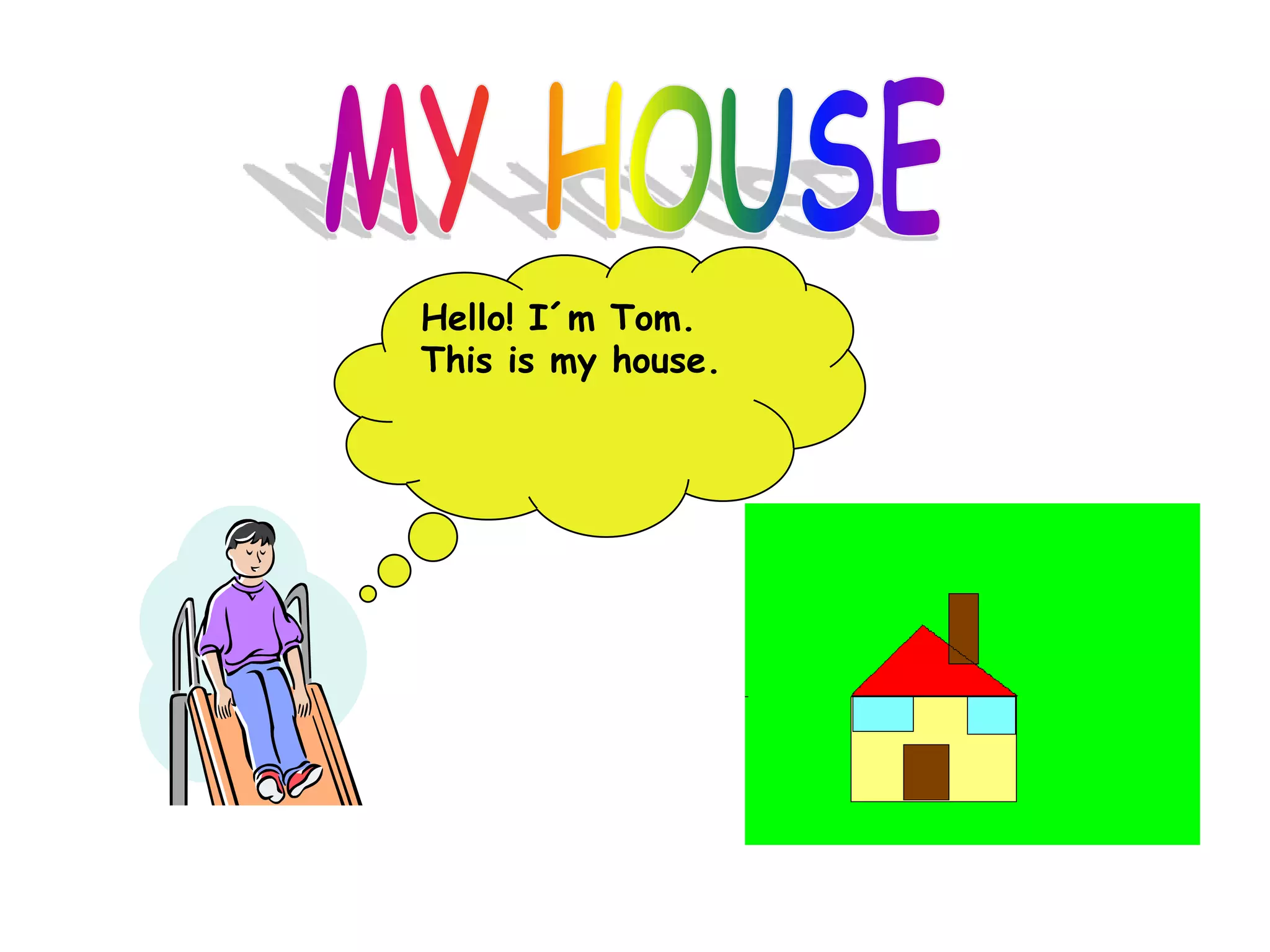 Tom introduces himself and describes his house which contains a kitchen with a sink, a bathroom with a shower, and a bedroom with a bed.