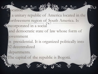 Colombia is a unitary republic located in northwestern South America, with Spanish as the official language. It is politically organized into 32 departments, with Bogota as the capital city. The national flag features yellow, blue and red colors that symbolize Colombia's soil, sky, and blood shed for independence.