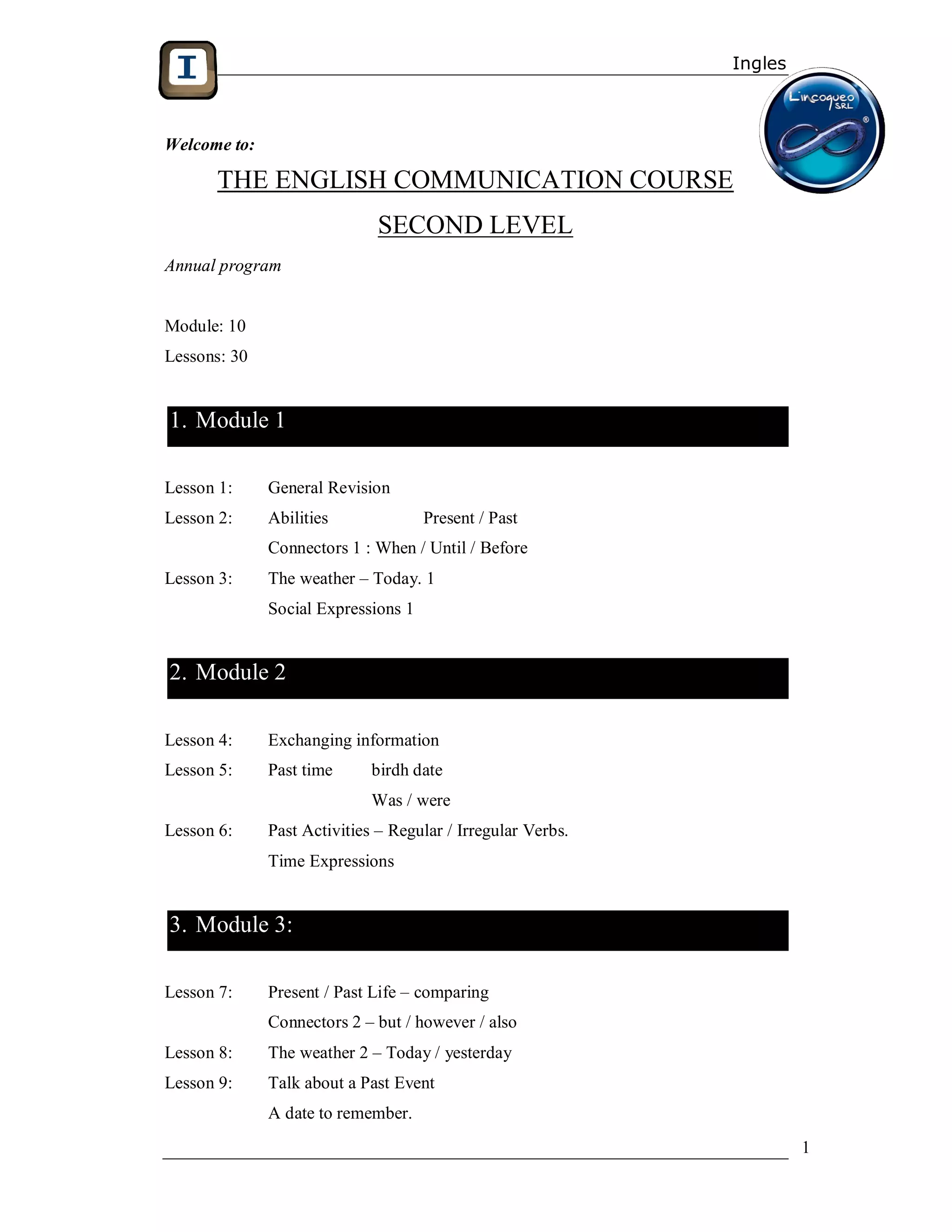 This document outlines an English communication course consisting of 10 modules with 30 total lessons. Each module covers 3 lessons on a particular topic, such as the weather, past activities, food/drink, describing people, comparisons, directions, and experiences in life. The course aims to teach students abilities in both present and past tenses, as well as connectors, time expressions, and other grammar and vocabulary points through a variety of lesson topics.