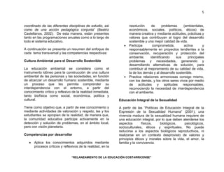 The document discusses the importance of incorporating transversal themes into Costa Rica's educational curriculum. It identifies the values axis and four transversal themes: environmental culture for sustainable development, comprehensive sexuality education, health education, and human rights education for democracy and peace. For each theme, it outlines the objectives and defines competencies students should develop in areas like critical thinking, participation, and respect for diversity.