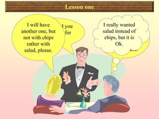 The document discusses ordering dinner and catching up with an acquaintance named Helen. One person orders a steak with chips but requests salad instead of chips for their second meal. They realize they wanted salad the first time as well. Another person named David remembers Helen from before and they have a pleasant reintroduction. Someone else was unsure if David would remember Helen but he did. Mary confirms she knows how to create a product presentation using PowerPoint after being asked about it.