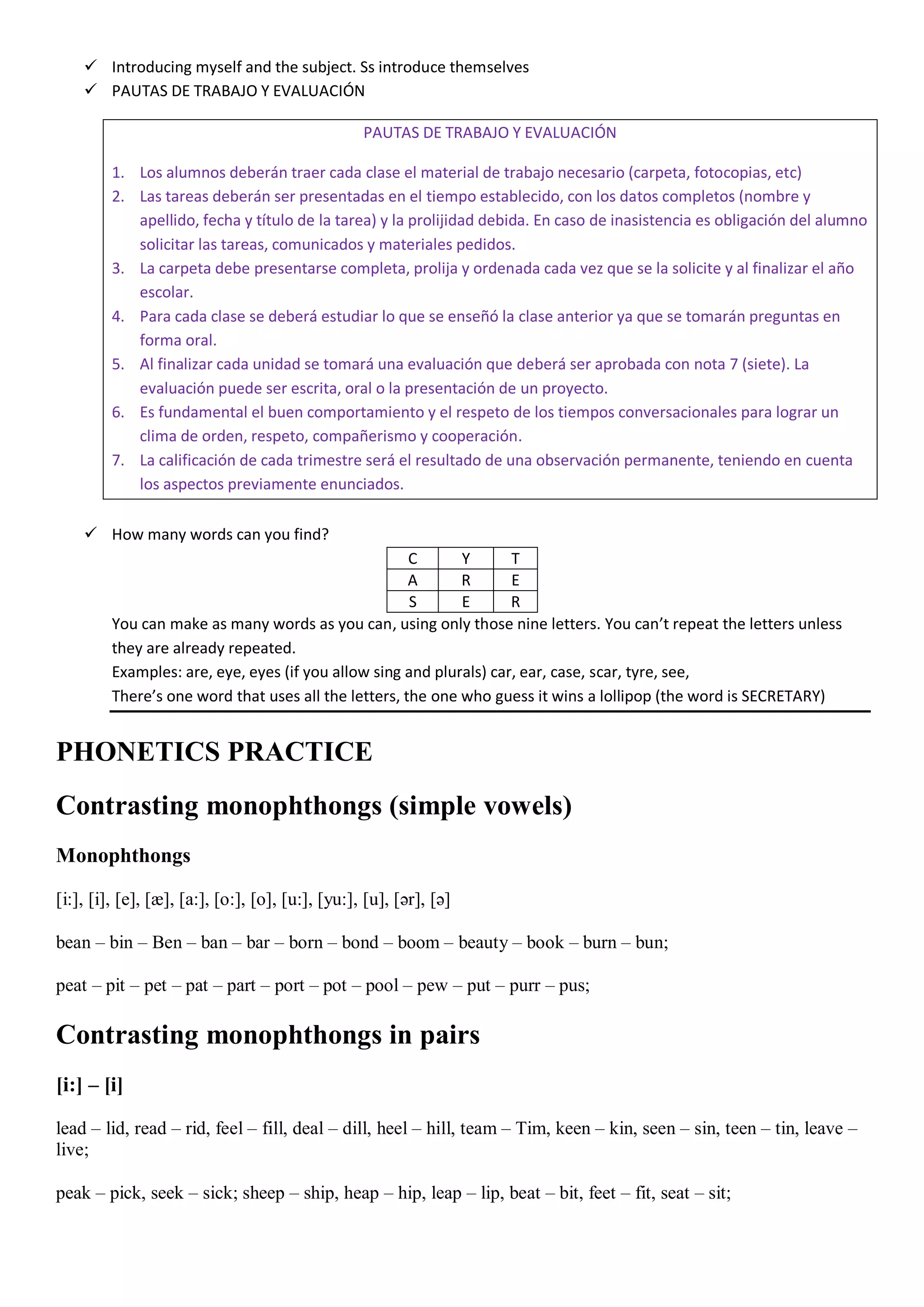 The document provides guidelines and evaluation criteria for students. It outlines 7 points: 1) Students must bring required materials to class. 2) Assignments must be submitted on time with complete information. 3) Folders must be presented fully, neatly, and orderly. 4) Students must study the previous lesson for each class. 5) Evaluations will be given at the end of each unit and must be passed with a 7. 6) Good behavior and respecting conversation times are important. 7) Grades each trimester will consider permanent observation of the outlined aspects.