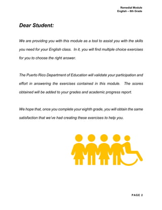 This document is a remedial module from the Puerto Rico Department of Education for an 8th grade English class. It contains an introductory letter addressed to the student explaining that completing the exercises in this module will help improve their English skills and be added to their grades. The module consists of multiple choice exercises spanning various pages to assist the student with skills needed for their English class. It includes the student's name, school, and other identifying information.