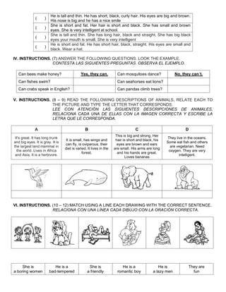 This document appears to be a student's English exam from a Telesecundaria school in Zacapoaxtla, Mexico. It contains multiple choice questions, fill-in-the-blank exercises, and matching activities testing the student's English language skills. The exam covers topics like verb conjugations, parts of speech, word order, and comprehension of short texts. It aims to evaluate the student's progress in their second language English coursework.