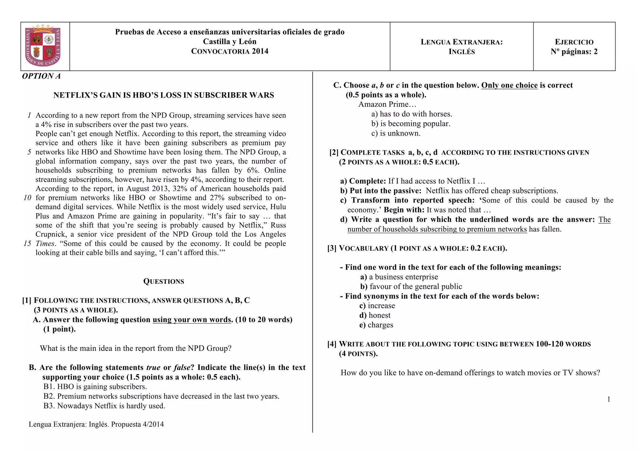 The document is a reading comprehension exam on a text about streaming services like Netflix gaining subscribers while premium cable networks like HBO are losing them.