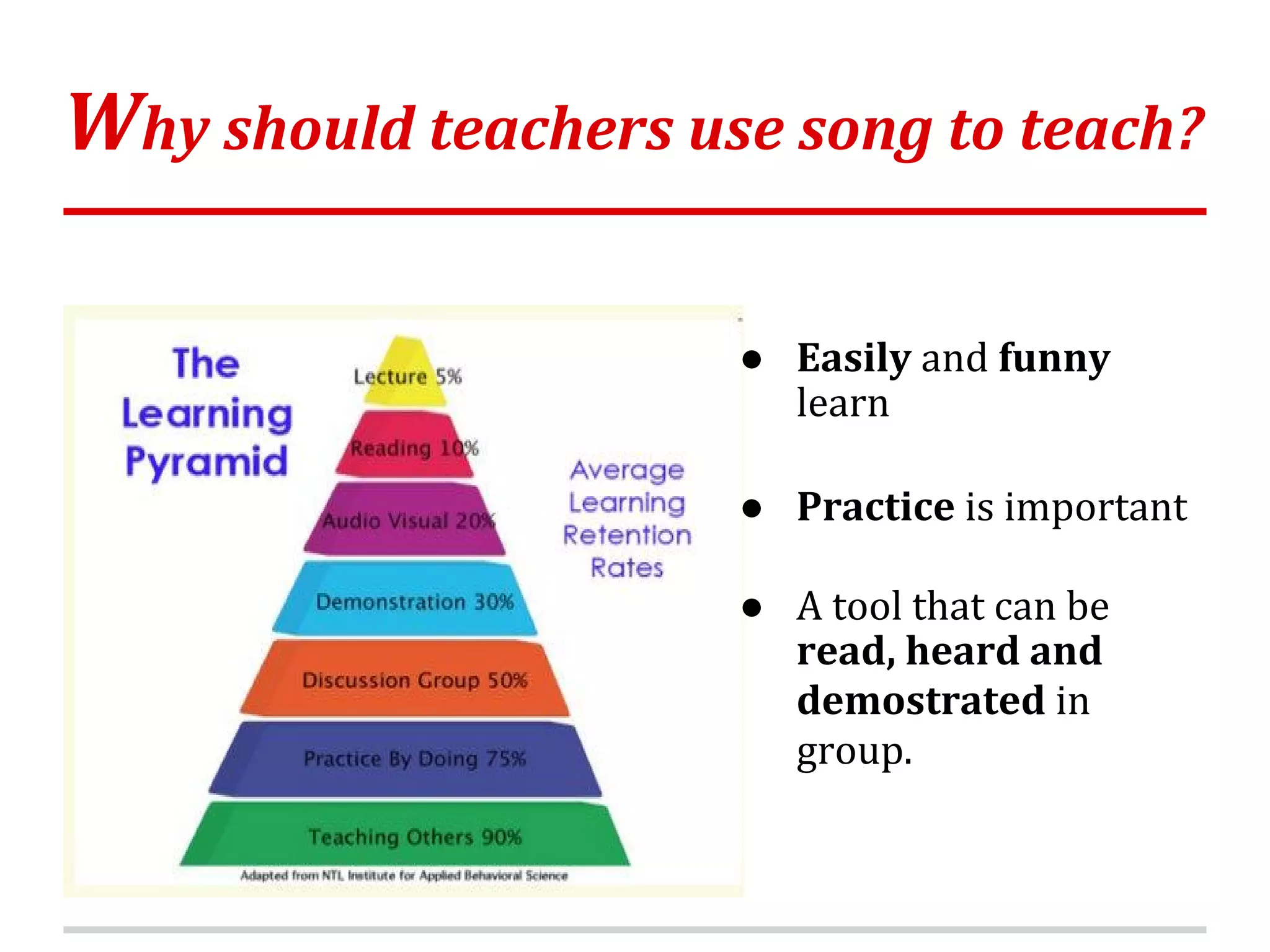 Teachers can use songs to make learning fun and help students practice vocabulary, grammar, pronunciation, and culture. Songs engage the brain and motivate learning through repetition and rhythm. Teachers can use songs for activities related to vocabulary like clapping games, omitting letters, or comparing styles; grammar like tenses, questions, or expressions; and culture like typical songs from different times or places. Teachers can find suitable songs on pages like Dream English, Anglomanicy, and Teach Children ESL that organize songs by topic, include descriptions, and allow downloading.