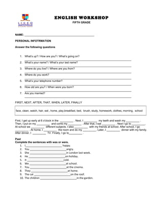 The document appears to be a worksheet for a 5th grade English workshop. It contains sections for students to provide personal information like name, address, age. It also contains exercises on using temporal transition words like first, next, after that. There are also grammar exercises on using was/were in the past tense and putting verbs in simple past tense. It includes a drawing activity and finishing story prompts.
