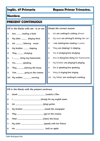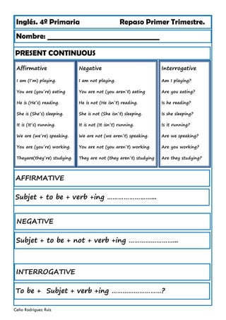 This document provides a review of present continuous tense, there is/there are, and to be/to have got for 4th grade Spanish students. It includes examples of these grammar structures in affirmative, negative, and interrogative forms. There are exercises for students to practice filling in blanks, choosing correct answers, and transforming sentences between forms. The review covers common verbs like play, eat, read and topics like family, possessions, and locations.