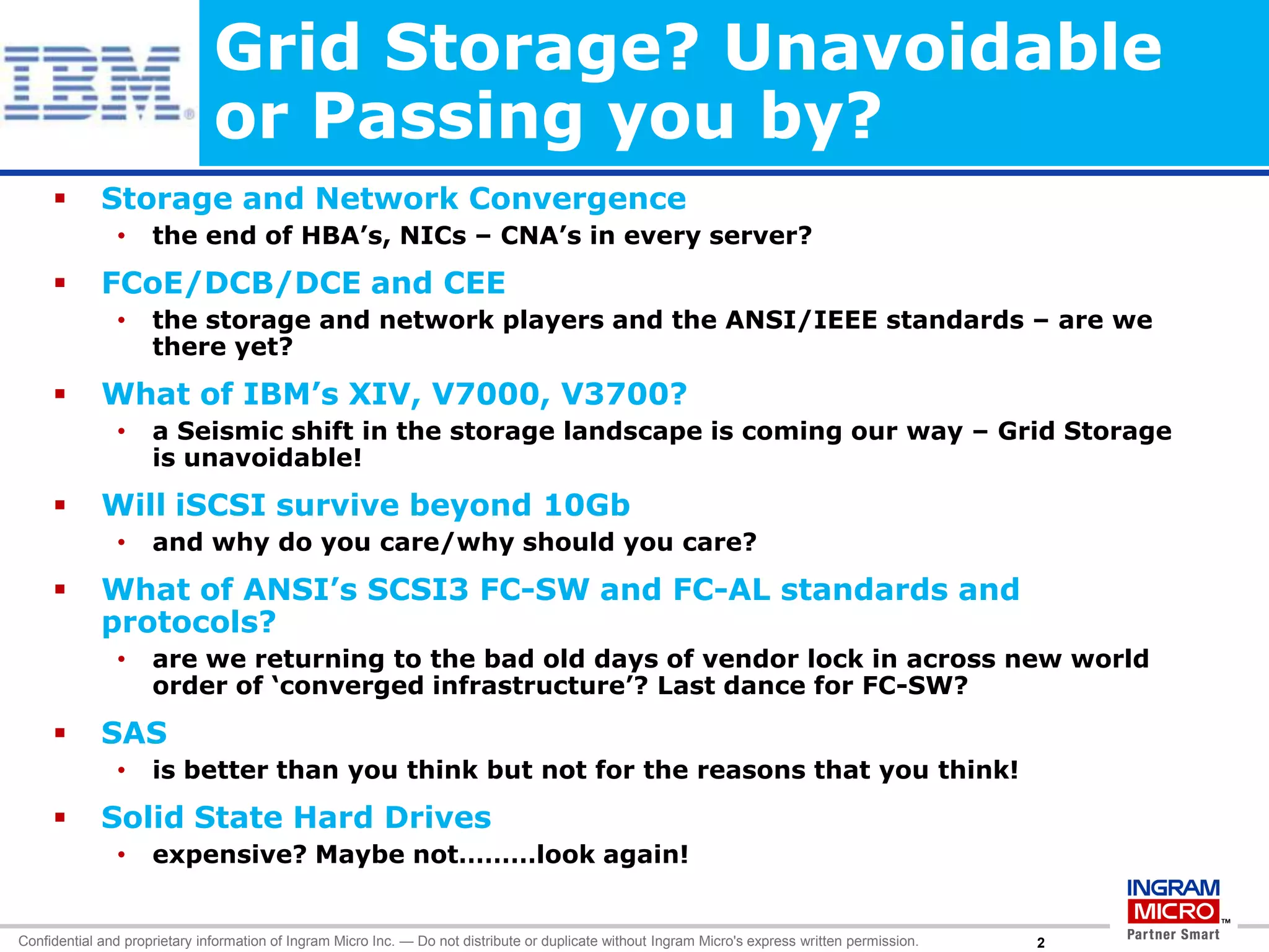 The document discusses emerging trends in storage technologies, including storage and network convergence, Fibre Channel over Ethernet (FCoE), and solid state drives. It notes that grid storage is becoming unavoidable as these technologies advance. The document also summarizes IBM's Storwize family of storage systems and provides success stories for the Storwize systems sold through Ingram Micro.
