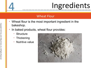 This document discusses wheat flour and other flours used in baking. It describes the different types of wheat varieties used to make flours for different purposes like bread or pastries. The key components of wheat and flour are also outlined, including the bran, germ, endosperm, starch, protein, moisture and other nutritional components. Different grades of wheat flour are defined according to their extraction rate.