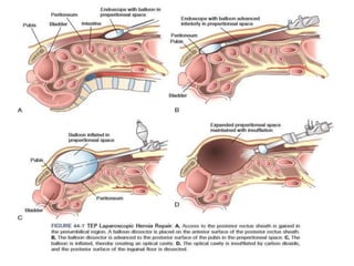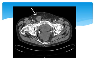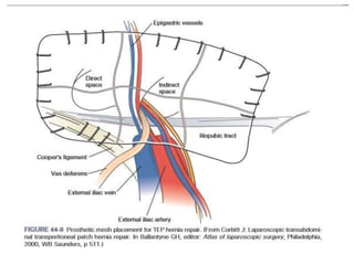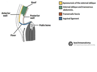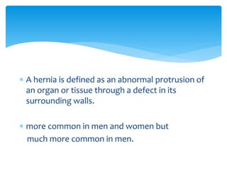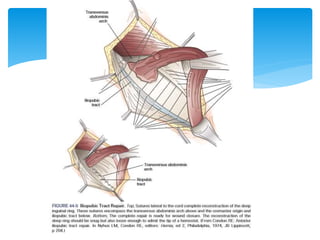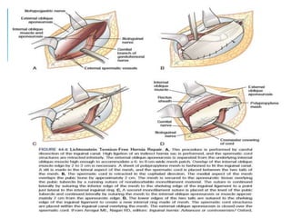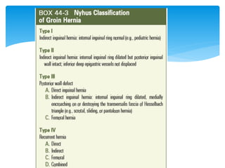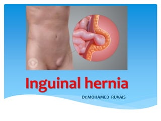 An inguinal hernia occurs when an organ or tissue protrudes through a weak spot in the abdominal wall. There are two main types - indirect (lateral) hernias which occur through the deep inguinal ring and direct (medial) hernias which occur through Hesselbach's triangle. Surgical repair is the standard treatment and involves identifying and reducing the hernia sac, ligating the neck if present, and reconstructing the posterior wall with sutures or a mesh. Complications can include incarceration, strangulation or infection if left untreated.