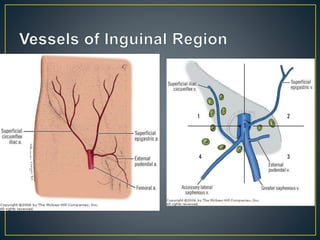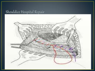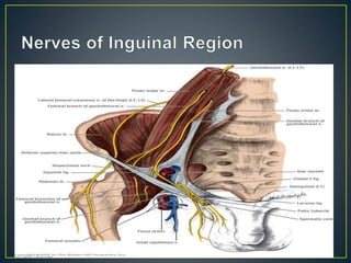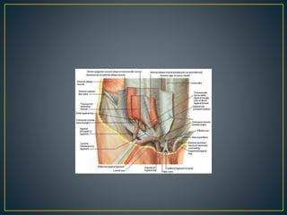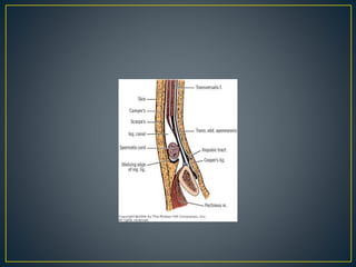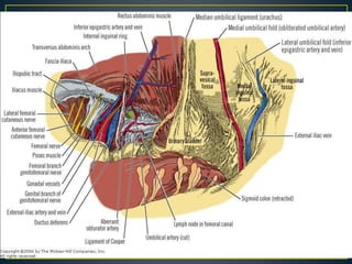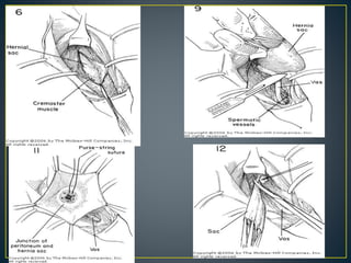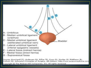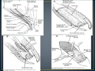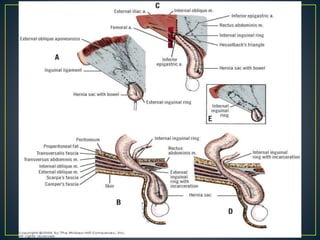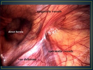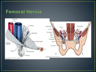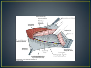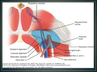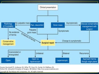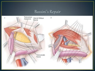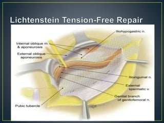This document discusses hernias, including their anatomy, types, causes, diagnosis, and treatment options. It provides details on the layers of the abdominal wall and inguinal canal. There are two main types of hernias - indirect and direct. Treatment options include open repair techniques like Shouldice repair as well as laparoscopic techniques like TAPP and TEP which involve placing a mesh to reinforce the abdominal wall. Complications of hernia repair can include recurrence, chronic pain, infection, and injury to surrounding structures.
