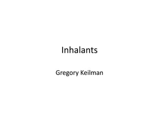 Inhalants are toxic vapors from substances like cleaning products and paint thinner that slow the body's functions. Short term effects include slurred speech, dizziness, and hallucinations. Long term use can cause muscle weakness, brain damage, and heart or lung damage. Repeated inhalation can cause sudden death from heart failure within minutes, called sudden sniffing death. Younger children abuse inhalants more than older children, and signs of abuse include red nose and loss of appetite.