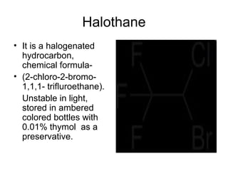 Halothane is a halogenated hydrocarbon anesthetic agent that was first synthesized in 1951 and introduced for use in anesthesia in 1956. It became popular due to its pleasant odor and lack of explosiveness, but has been replaced in developed countries by sevoflurane due to the risk of severe liver injury known as halothane hepatitis. Halothane sensitizes the myocardium to catecholamines and is contraindicated in patients with heart failure or those susceptible to arrhythmias. It is still used in the induction and maintenance of anesthesia.