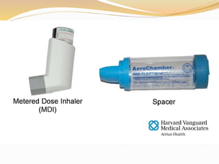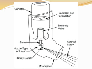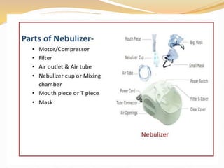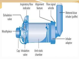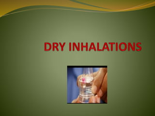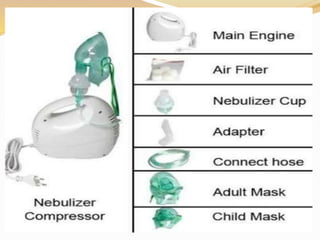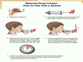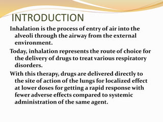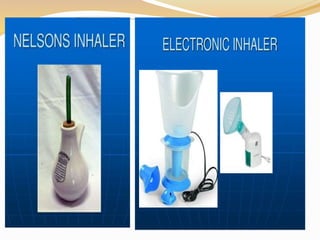 Inhalation therapies deliver drugs directly to the lungs for localized treatment of respiratory disorders, offering benefits such as rapid response and reduced adverse effects compared to oral administration. The document outlines various inhalation methods, including steam inhalation, nebulization, and metered dose inhalers, as well as the medications used and their indications. It also details the procedures for using each type of inhaler, including patient positioning, monitoring, and equipment maintenance.
