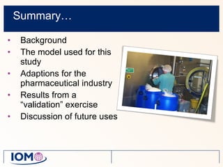 The document discusses a model developed to assess occupational exposure to pharmaceutical powders, which can pose health risks if inhaled. It highlights challenges in measuring exposure due to variability and proposes a validated model that factors in various parameters, such as dustiness and material handling. The model's application in the pharmaceutical industry can help manage risks effectively, although improved data on powder dustiness is needed.