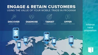 This document summarizes the value proposition and features of the Inhance Trade program. It allows retailers to get real-time trade-in values for customers' devices, engage customers through a mobile app, and transfer content from old to new devices to simplify the trade-in process. The program can be accessed through a generic app or integrated into a retailer's own mobile app to leverage their customer base. Metrics are also available to help retailers monitor engagement and improve the program over time.