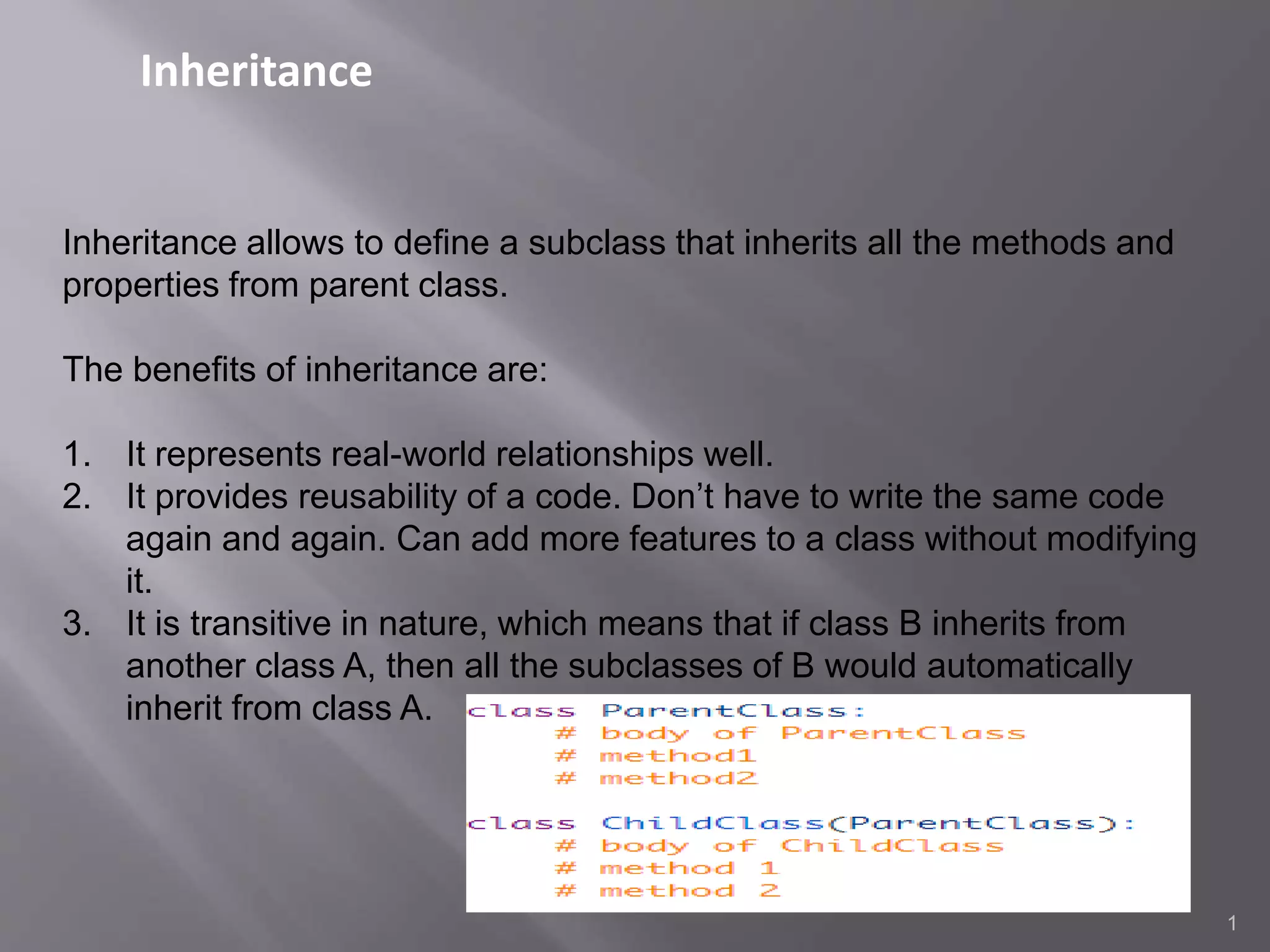 Inheritance allows a subclass to inherit methods and properties from a parent class. The main types of inheritance are single, multiple, multilevel, hierarchical, and hybrid inheritance. Method overriding allows a child class to provide its own implementation of a method defined in the parent class, while maintaining the same method signature. Abstract classes define abstract methods that must be implemented in child classes, allowing for common interfaces. Access specifiers like public, protected, and private are used to control access to class methods and properties.