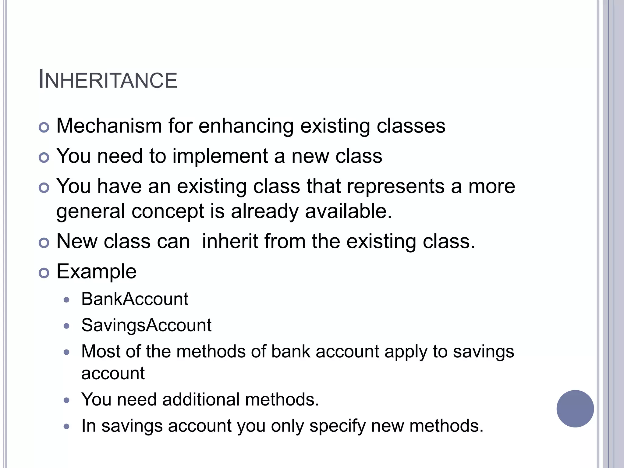 This document discusses inheritance in object-oriented programming. It explains that inheritance allows a subclass to inherit attributes and behaviors from a superclass, extending the superclass. This allows for code reuse and the establishment of class hierarchies. The document provides an example of a BankAccount superclass and SavingsAccount subclass, demonstrating how the subclass inherits methods like deposit() and withdraw() from the superclass while adding its own method, addInterest(). It also discusses polymorphism and access control as related concepts.