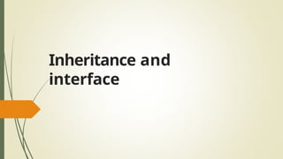The document discusses inheritance and interfaces in Java, highlighting the types of inheritance (single, multilevel, hierarchical) and explaining concepts such as method overriding, the use of the super keyword, and the final keyword. It emphasizes the importance of inheritance for code reusability and introduces the concept of interfaces for achieving multiple inheritance, along with examples demonstrating these principles. Additionally, it covers access specifiers and provides code snippets to illustrate the discussed concepts.
