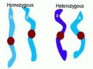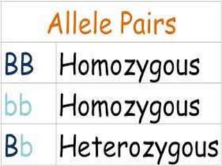 Inheritance is the passing on of characteristics from one generation to the next. Chromosomes are structures in cells that contain genes, which are segments of DNA that code for particular traits. Alleles are variations of a gene that can cause differences in a characteristic. A dominant allele will be expressed over a recessive allele. An individual's genotype refers to their genetic makeup, while their phenotype describes their observable physical traits.