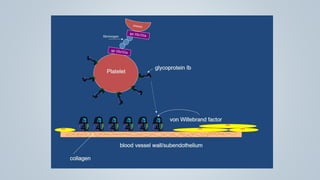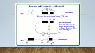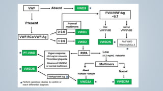 This document provides an overview of inherited bleeding disorders, focusing on von Willebrand disease, hemophilia A, and hemophilia B. It classifies inherited bleeding disorders and discusses their prevalence. For von Willebrand disease, it describes the classification, etiology, functions of von Willebrand factor, diagnosis of different types, and management. It also discusses the formation of the primary hemostatic plug. For hemophilia A and B, it covers clinical manifestations, diagnosis, and management, including use of factor replacement therapies.