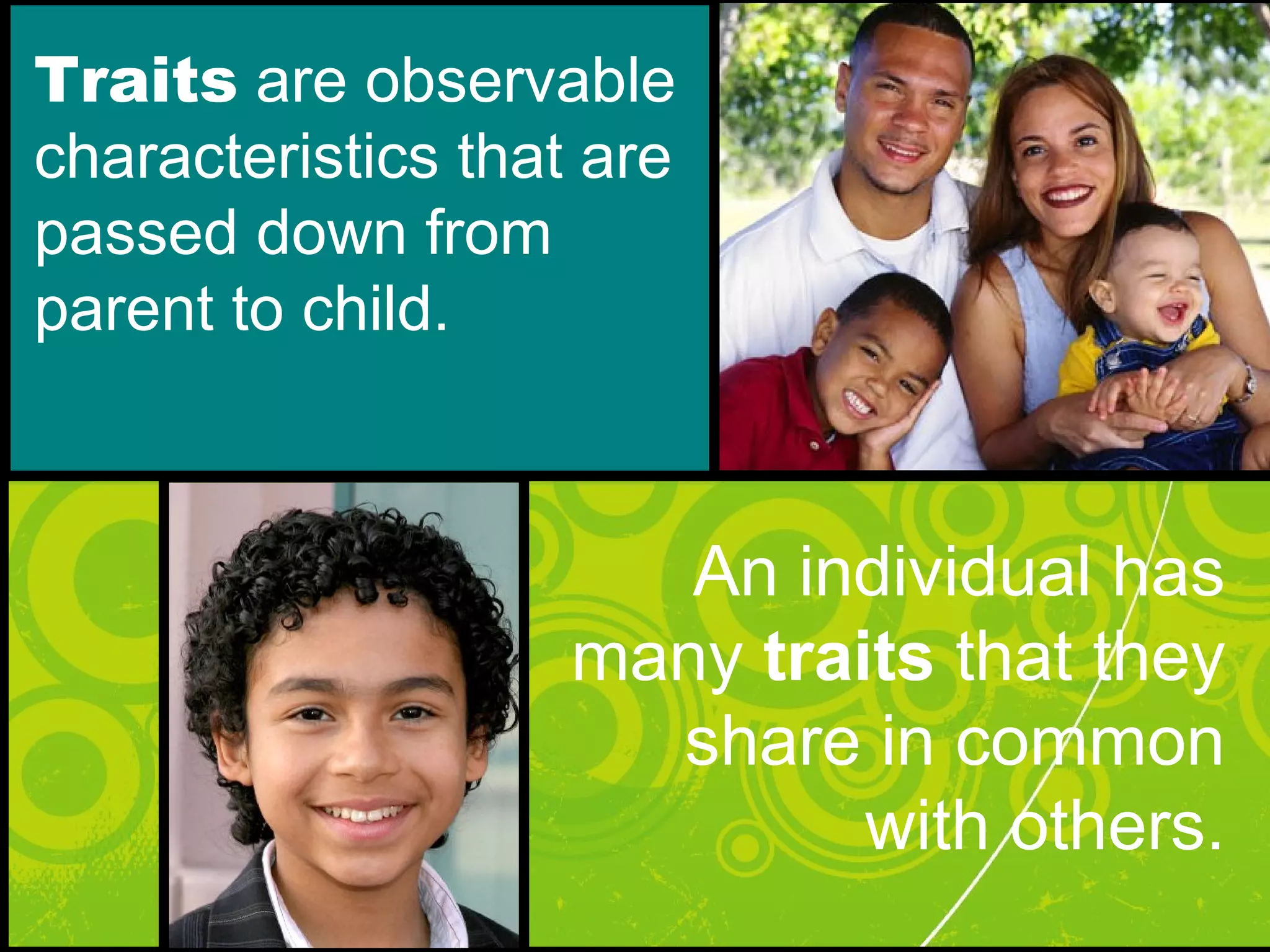 This document lists and defines common human traits such as earlobe type, handedness, hair texture, and eye color that are passed down from parents and make each individual unique, even as some traits are more common in populations than others. It then provides a table to inventory the traits of students in a class.