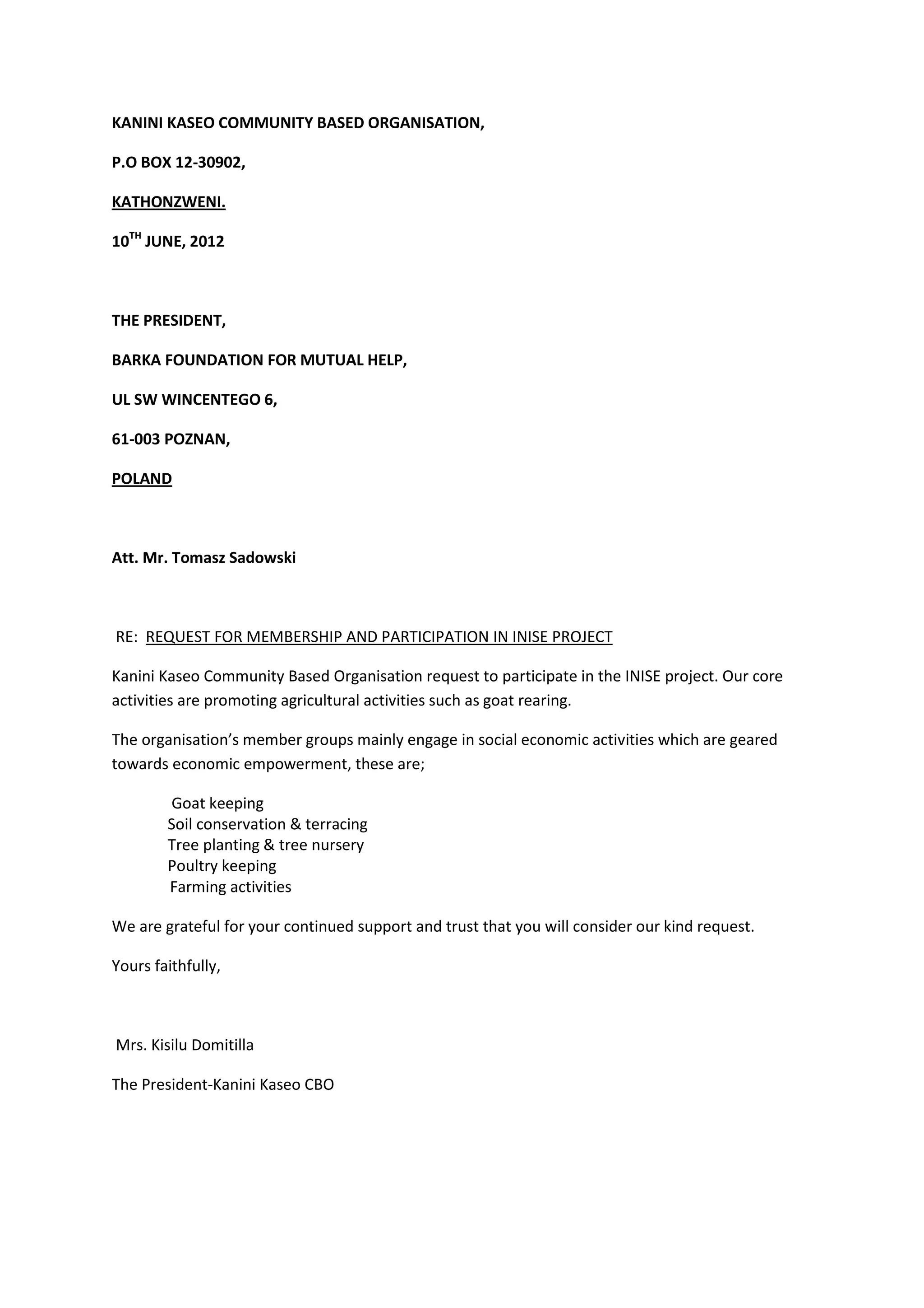 Kanini Kaseo Community Based Organisation, located in Kathonzweni, Kenya, has requested membership and participation in the INISE project from the Barka Foundation for Mutual Help in Poznan, Poland. The organisation's main activities involve promoting agriculture, especially goat rearing, and its member groups engage in economic empowerment activities like goat keeping, soil conservation, tree planting, poultry keeping, and farming.